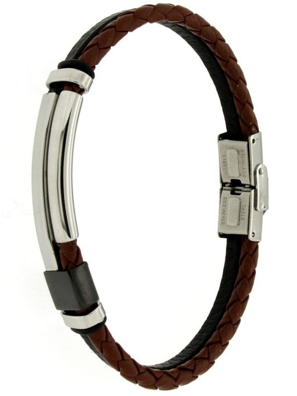 Ανδρικό βραχιόλι κατασκευασμένο από ανοξείδωτο ατσάλι και δύο δέρματα, δίχρωμο σε καφέ μαύρο χρώμα.Διάσταση 22εκ. Με δυνατότητα μείωσης μεγέθους.