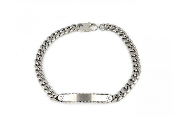 Ανδρικό βραχιόλι ταυτότητα κατασκευασμένο από ανοξείδωτο ατσάλι σε ασημί χρώμα.Διάσταση 22εκ.  Διατίθεται και σε συσκευασία δώροgift