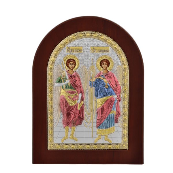 Ασημένια εικόνα οι Άγιοι Ταξιάρχες με επίχρυσες λεπτομέρειες και σμάλτο.Διάσταση 10Χ14