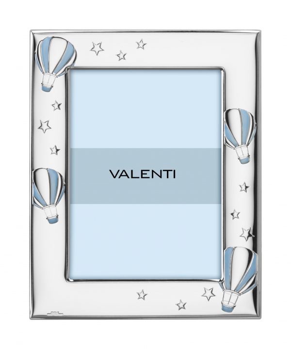 Ασημένια παιδική κορνίζα με αερόστατα σε γαλάζια απόχρωση.Διάσταση φωτογραφίας 13Χ18