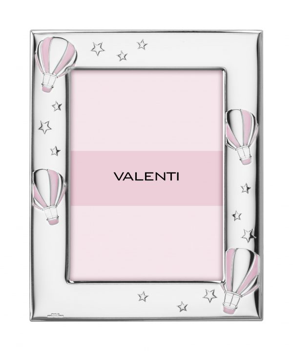 Ασημένια παιδική κορνίζα με αερόστατα σε ροζ απόχρωση.Διάσταση φωτογραφίας 13X18