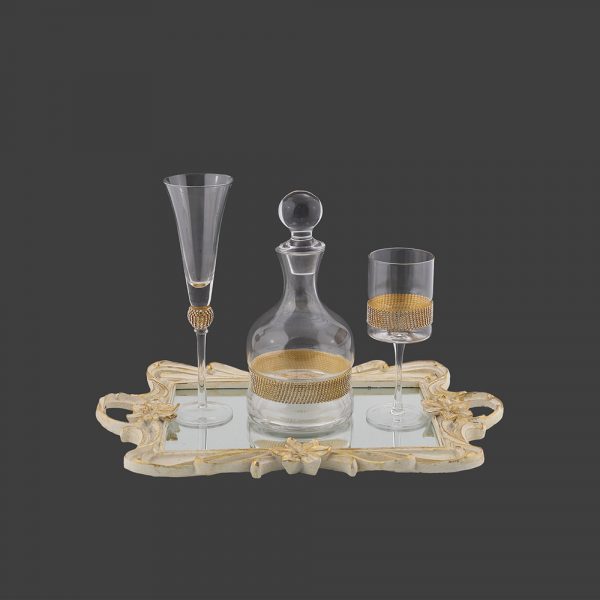 Σετ γάμου καράφα-ποτήρι΄κρασιού κρυστάλλινα σε απόχρωση χρυσού με strass.  ΤΟ ΣΕΤ ΠΕΡΙΛΑΜΒΑΝΕΙ ΤΗΝ ΚΑΡΑΦΑ ΚΑΙ ΤΟ ΠΟΤΗΡΙ ΚΡΑΣΙΟΥ