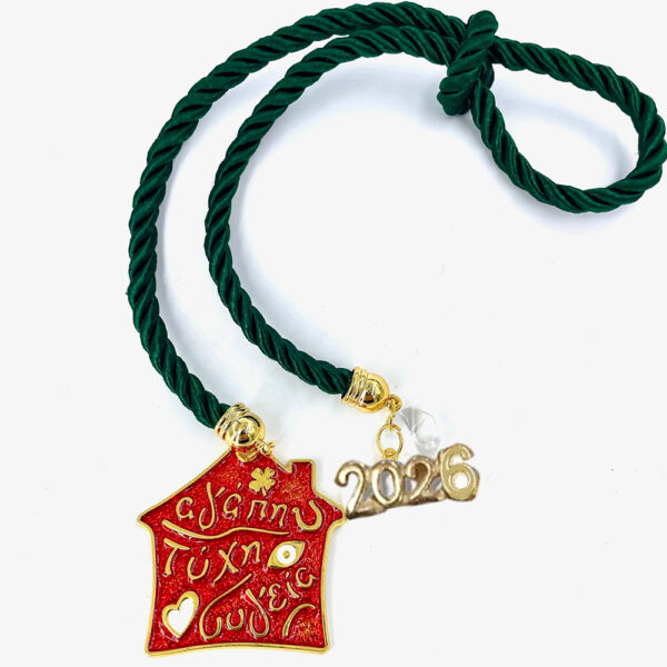 Μεταλλικό γούρι σπιτάκι με ευχές 25cm με τρίκλωνο κορδόνι κυπαρισσί,και κρύσταλλο. Αν επιθυμείτε επιπλέον ποσότητα από την διαθέσιμη επικοινωνήστε με το κατάστημα