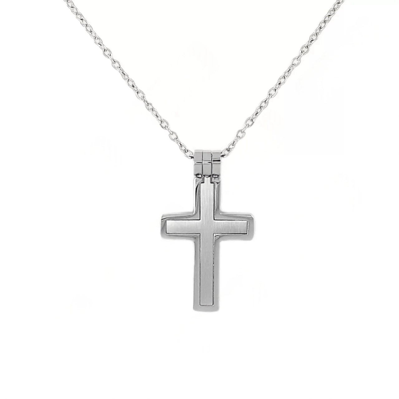 Ανδρικός σταυρός με αλυσίδα απο ανοξείδωτο ατσάλι σε ασημί χρώμα.Αλυσίδα 50+5εκ. Διάσταση σταυρού 2,4εκ.