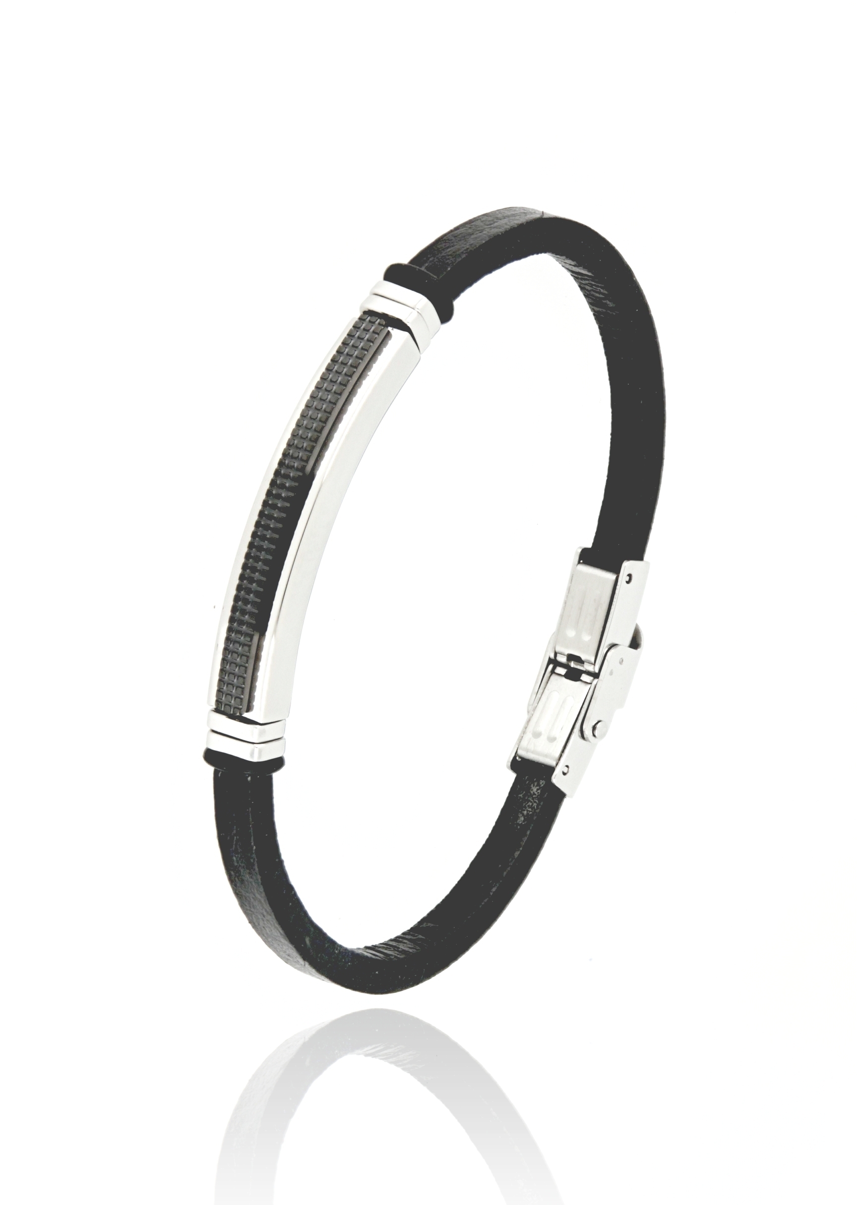 Ανδρικό βραχιόλι κατασκευασμένο από ανοξείδωτο ατσάλι και δέρμα σε μαύρο χρώμα.Διάσταση 22εκ. Με δυνατότητα μείωσης μεγέθους.