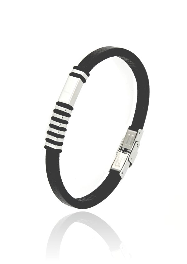 Ανδρικό βραχιόλι κατασκευασμένο από ανοξείδωτο ατσάλι και δέρμα σε μαύρο χρώμα.Διάσταση 22εκ. Με δυνατότητα μείωσης μεγέθους.