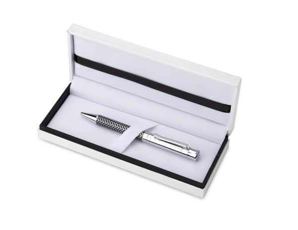 Στυλό roller ball σε θήκη πολυτελείας με ασημένιο στοιχείο.
