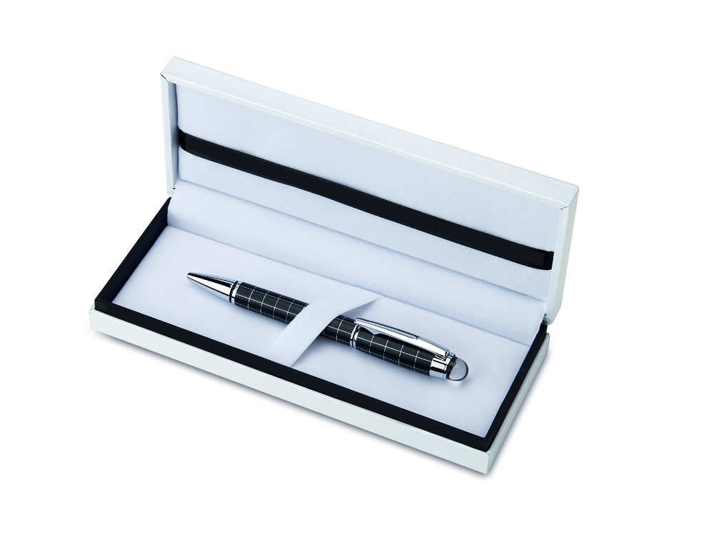 Στυλό roller ball σε καρό σχέδιο και θήκη πολυτελείας με ασημένιο στοιχείο.